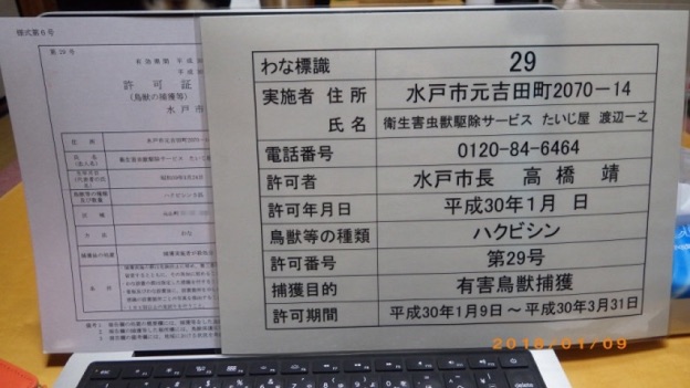 同時に、役所に有害獣捕獲許可を提出し、